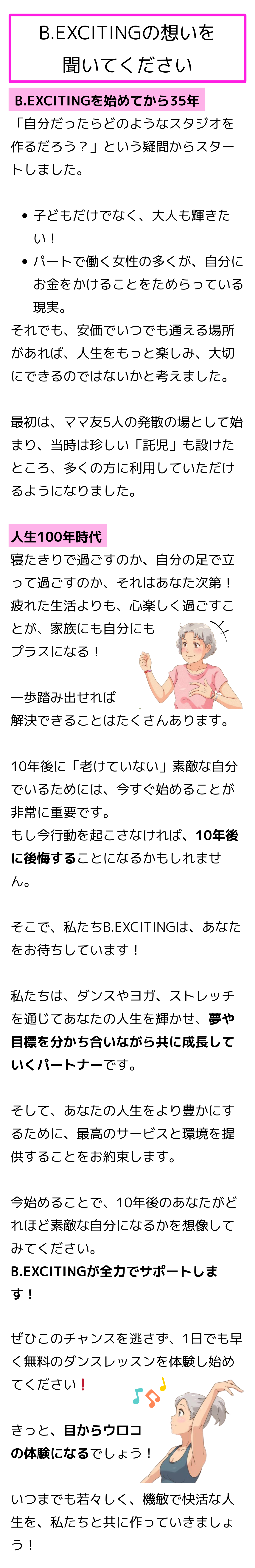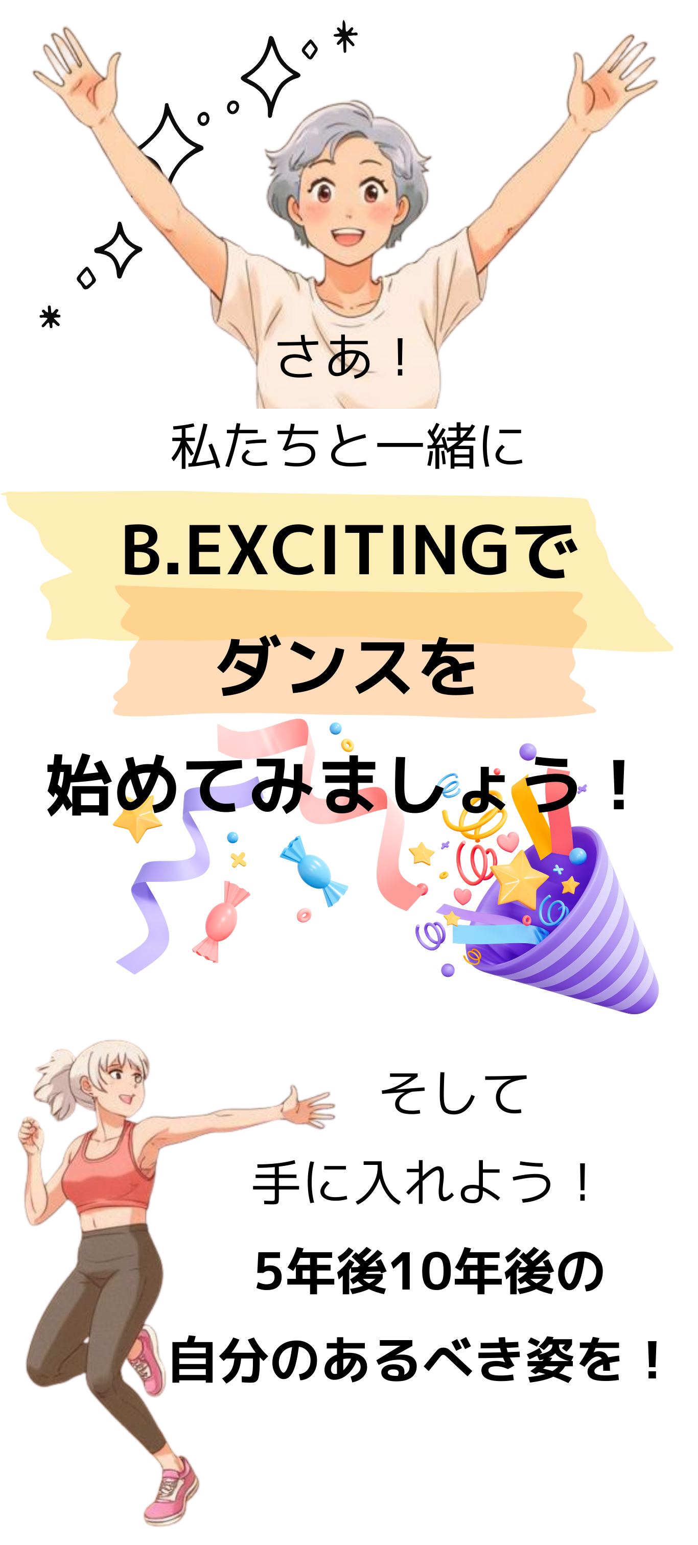 [B.excitingダンススタジオ]では、個人情報を厳重に管理いたします。お申し込み時にご記入いただく情報はお知らせ、ご案内のみに利用させていただきます。第三者が情報を閲覧、使用することは一切ありません。